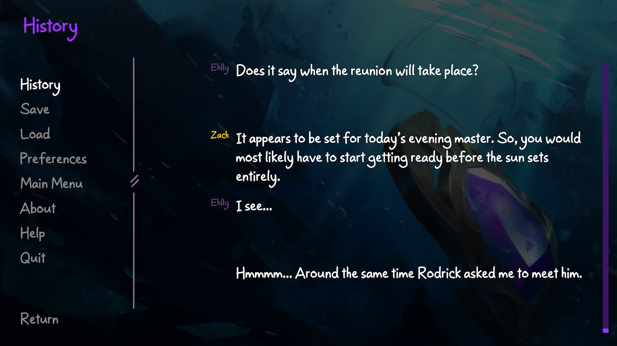 Just want to report a bug I found. If you choose to have Ehlly trust Ikalis and approach him when he has a mana flame dancing in his palm despite his fear of fire, when Ikalis says, "See? It's safe.", there is no label with Ikalis' name at the top of the text box, making it seem like Ehlly is thinking this despite the CG showing that he is speaking.